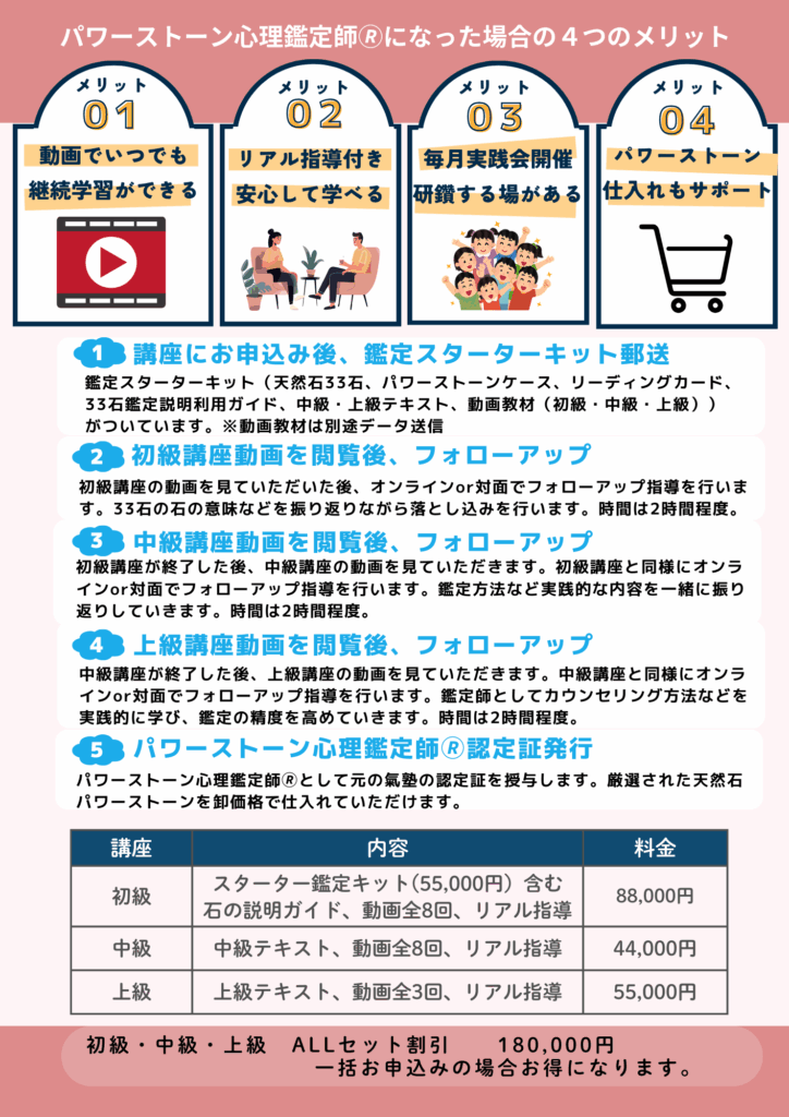 はんすまのメニューのひとつにご自身の深層心理がわかるパワーストーン心理鑑定があります。 この鑑定は、ご自身にとって、いま必要なメッセージや潜在的なテーマがわかり、自分の進む方向や、何らかの迷いや不安を取り除き、ご自身らしい生き方が実現できるメソッドでもあります。 2026年2期生を募集することになりました。無料体験会も実施しています。是非、お問合せください。