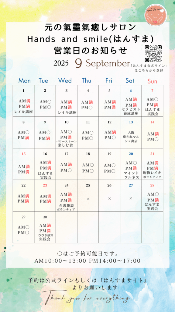 Hands and smile(はんすま)2025年9月の営業日のお知らせ 2025 9/09 お知らせ 2025-07-31 9月スケジュールをお知らせします。 こころと身体のメンテナンスを大事に、月1でもご自身と向き合う日をとってあげてくださいね。 お知らせ よかったらシェアしてね! URLをコピーしました! 10月イベントスケジュールを動画で紹介します Hands and smile(はんすま)2025年10月の営業日のお知らせ